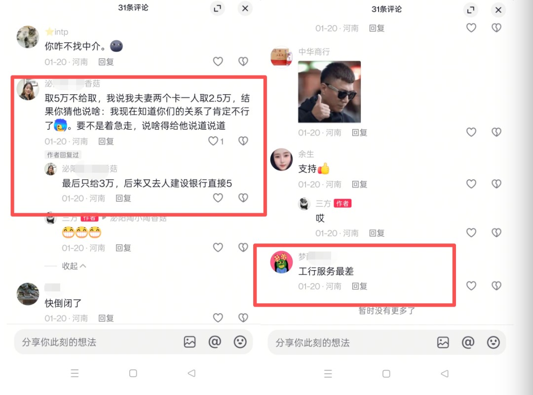 媒體雖然沒有找到這條視頻的源頭發(fā)布媒體,通過知情人獲取到該視頻剛發(fā)布后多名網(wǎng)友的留言截圖,其中網(wǎng)友“稱心如意”留言“錢沒有送到位”“網(wǎng)紅好人一生平安”留言“沒有送紅包”“財源廣進”留言“我有個親戚在工商行上班,李行長,管的太寬了、我也不跟他合作了”;更有網(wǎng)友“泌陽陶小陶香菇”在留言中表示“取5萬不給取,我說我夫妻兩個卡一人取2.5萬,結(jié)果你猜他說啥:我現(xiàn)在知道你們的關(guān)系了肯定不行了。要不是著急走,說啥得給他說道說道,最后只給3萬,后來又去了建設(shè)銀行直接取5(萬)”
