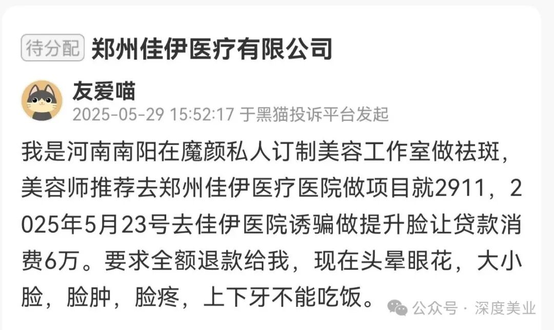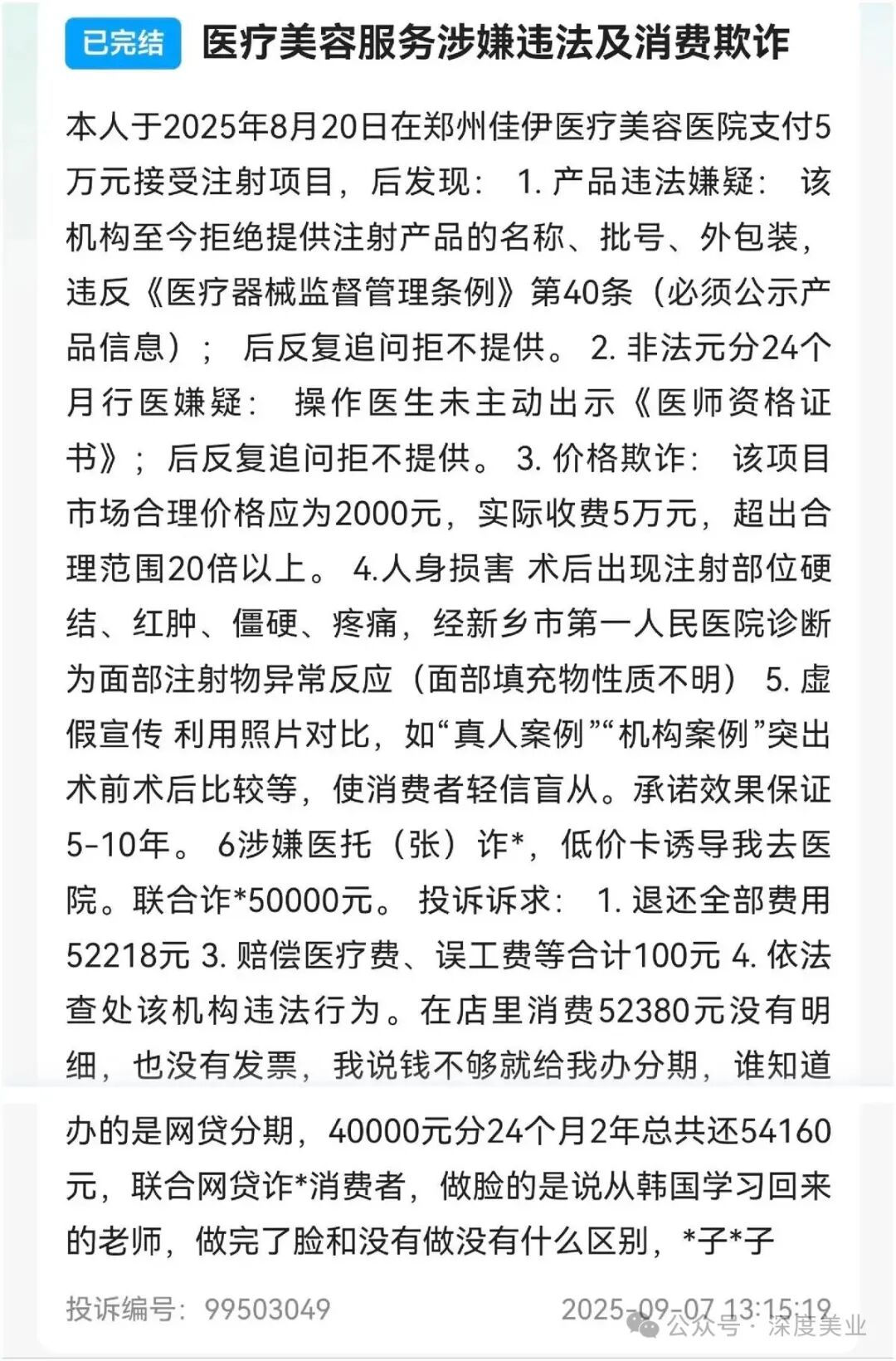 2024年10月30日,還有消費(fèi)者在黑貓投訴平臺(tái)發(fā)起對(duì)鄭州佳伊醫(yī)療科技有限公司的投訴。該消費(fèi)者稱鄭州佳伊醫(yī)療科技有限公司存在不正當(dāng)競(jìng)爭(zhēng)、利用醫(yī)托渠道、使用非衛(wèi)生技術(shù)人員從事醫(yī)療衛(wèi)生技術(shù)工作、價(jià)格未經(jīng)公示、醫(yī)生資質(zhì)存疑、消毒藥品不合格、超說明書使用第三類醫(yī)療器械、手術(shù)注射前未起到實(shí)際風(fēng)險(xiǎn)告知義務(wù)等問題。