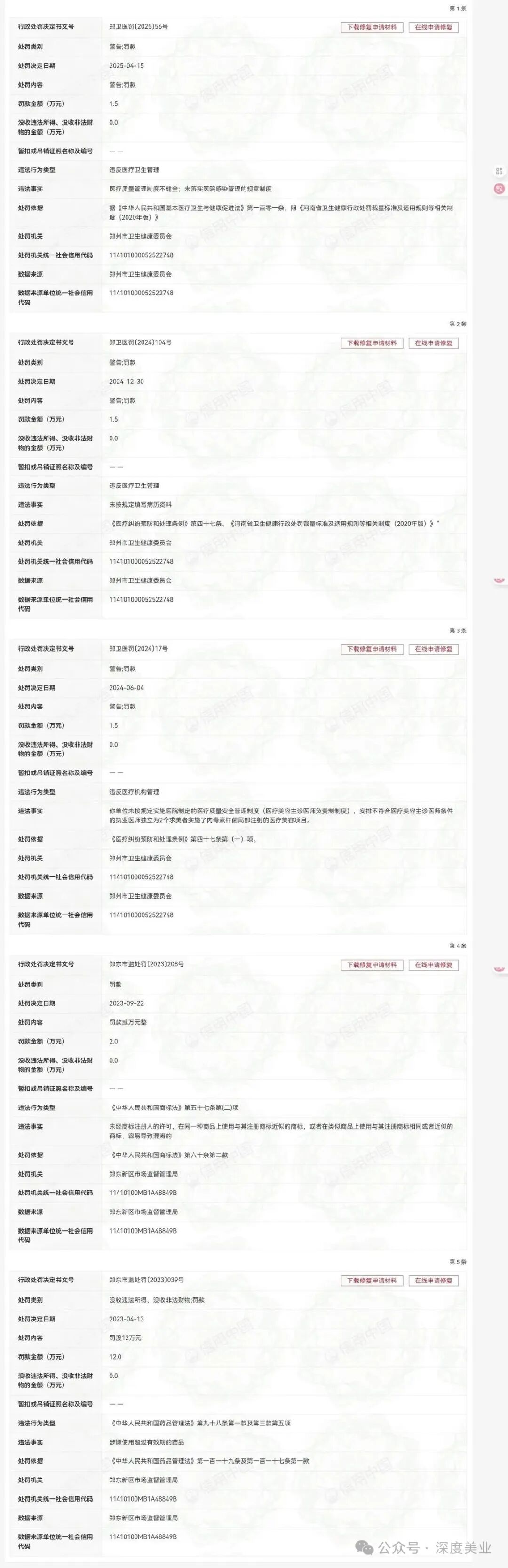 信用中國(guó)顯示,鄭州佳伊自2023年起到今年4月,累計(jì)受到相關(guān)監(jiān)管部門五次行政處罰。今年4月,還因違反醫(yī)療衛(wèi)生管理相關(guān)規(guī)定,存在醫(yī)療質(zhì)量安全管理制度不健全等原因被罰1.5萬元。其余處罰包括未落實(shí)醫(yī)院感染管理的規(guī)章制度、 未按照規(guī)定填寫病歷資料 、 未按規(guī)定實(shí)施醫(yī)療質(zhì)量安全管理制度,安排不符合美容主診醫(yī)師條件的執(zhí)業(yè)醫(yī)師獨(dú)立為2名患者實(shí)施了肉毒素注射面部注射醫(yī)療美容項(xiàng)目。未經(jīng)商標(biāo)注冊(cè)人的許可,在同一種商品上使用與其注冊(cè)商標(biāo)近似的商標(biāo),或者在類似商品上使用與其注冊(cè)商標(biāo)相同或者近似的商標(biāo),容易導(dǎo)致混淆的行為。涉嫌使用超過有效期的藥品??傆?jì)罰款金額高達(dá)18.5萬元。