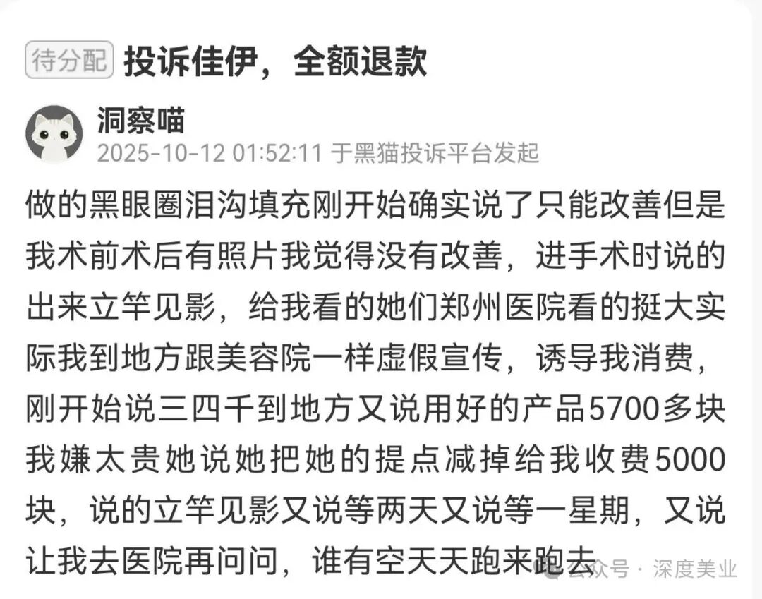 10月12日,一位消費(fèi)者于黑貓投訴平臺(tái)發(fā)起投訴,稱該消費(fèi)者做了黑眼圈淚溝填充項(xiàng)目,起初該機(jī)構(gòu)確實(shí)表示只能改善,該消費(fèi)者留存了術(shù)前術(shù)后照片,認(rèn)為術(shù)后結(jié)果未實(shí)現(xiàn)改善效果。該消費(fèi)者表示,進(jìn)入手術(shù)環(huán)節(jié)時(shí),該機(jī)構(gòu)稱術(shù)后效果立竿見影,還向該消費(fèi)者展示機(jī)構(gòu)的相關(guān)照片。該消費(fèi)者提到,照片里看起來規(guī)模較大,實(shí)際該消費(fèi)者到店后發(fā)現(xiàn)此處與美容院無異,存在虛假宣傳、誘導(dǎo)該消費(fèi)者消費(fèi)的情況。