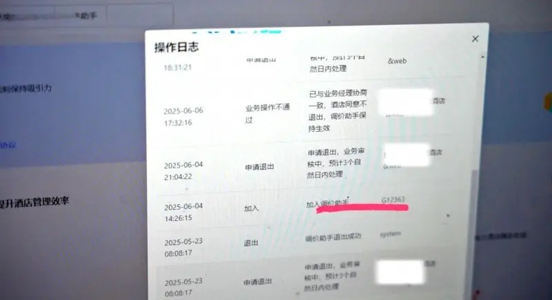 圖為商家退出攜程平臺“調(diào)價助手”成功后又被加入的記錄