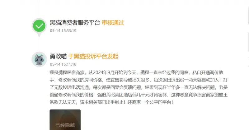 更有酒店業(yè)主在黑貓投訴平臺投訴中控訴“我是攜程民宿商家,從2024年9月開始到今天,攜程一直未經(jīng)過我的同意,私自開通調(diào)價助手,修改調(diào)低我的房間價格,便宜售賣導致?lián)p失很多。每次退出沒一兩天就自動加入,打了無數(shù)投訴電話溝通,每次都是回復會反饋問題,結(jié)果到現(xiàn)在半年多一直無法解決問題,老是偷偷修改調(diào)低我的價格,強迫我比美團酒店低幾十元才肯罷休,這種惡意競爭損害商家的霸王條款無法無天,請求相關(guān)部門出手制止!還商家一個公平的平臺!”