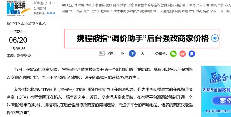 近日,鄭州多家酒店向市場監(jiān)管部門實名舉報攜程平臺“私自調(diào)價”行為,鄭州市市場監(jiān)督管理局已正式立案調(diào)查。這已是繼6月20日新華網(wǎng)曝光后,攜程“調(diào)價助手”功能進一步引發(fā)監(jiān)管關(guān)注。