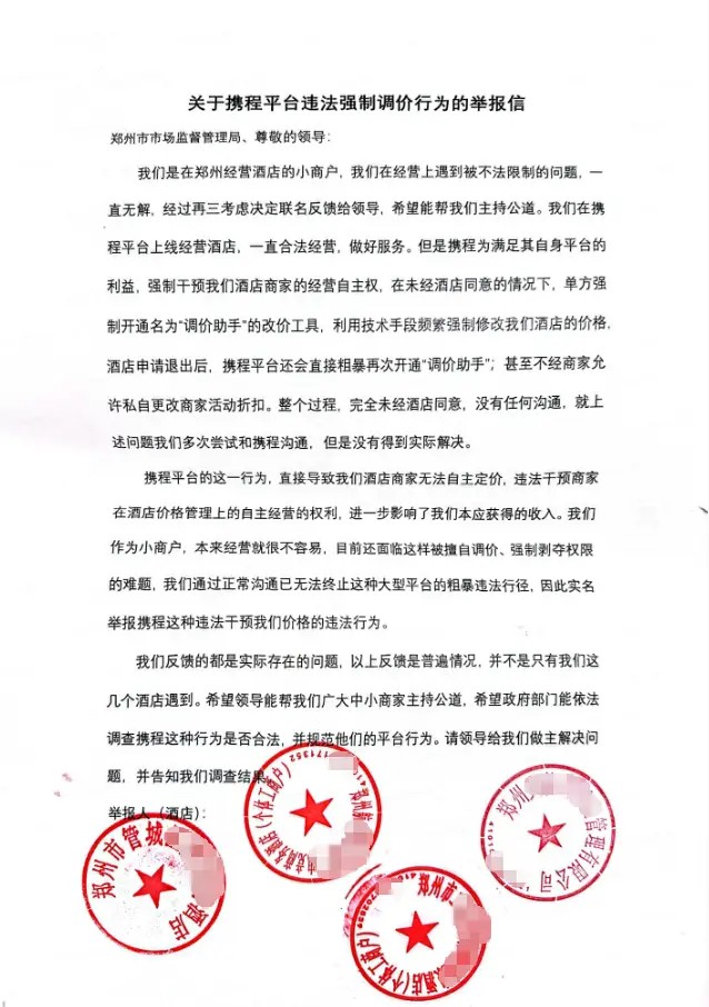 舉報信還指出“攜程平臺的這一行為,直接導致我們酒店商家無法自主定價,違法干預(yù)商家在酒店價格管理上的自主經(jīng)營的權(quán)利,進一步影響了我們本應(yīng)獲得的收入。我們作為小商戶,本來經(jīng)營就很不容易,目前還面臨這樣被擅自調(diào)價、強制剝奪權(quán)限的難題,我們通過正常溝通已無法終止這種大型平臺的粗暴違法行徑,因此實名舉報攜程這種違法干預(yù)我們價格的違法行為。”