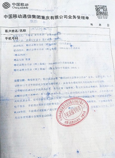 中國消費者報報道(記者 劉文新)中國移動通信集團(tuán)重慶有限公司(以下簡稱重慶移動公司)未按合同約定向用戶返還300元話費,案件經(jīng)過法院一審、二審,重慶移動公司被判處以公開、書面的形式向消費者賠禮道歉,但該公司拒絕履行判決。消費者無奈向法院申請強制執(zhí)行。重慶移動公司仍拒絕賠禮道歉,并向高級法院提起再審。重慶移動公司究竟有何底氣拒不認(rèn)錯?消費者想要一句道歉又有多難?《中國消費者》記者采訪了當(dāng)事人,對事情的經(jīng)過進(jìn)行了還原。 返還話費 久不兌現(xiàn) 2015年5月22日,重慶消費者顏浩在中國移動通信集團(tuán)網(wǎng)上商城購買了一部聯(lián)想A320T手機,售價499元。重慶移動公司當(dāng)日簽署業(yè)務(wù)受理單,承諾“贈送300元話費”,分12個月返還到顏浩的手機號18723436711上?!鞍凑占s定,重慶移動公司每個月應(yīng)返還25元到我手機上,但我一分錢都沒有收到過。”顏浩告訴《中國消費者報》記者,他多次撥打客服電話咨詢,要求返還話費,對方總是答復(fù)“正在處理”。