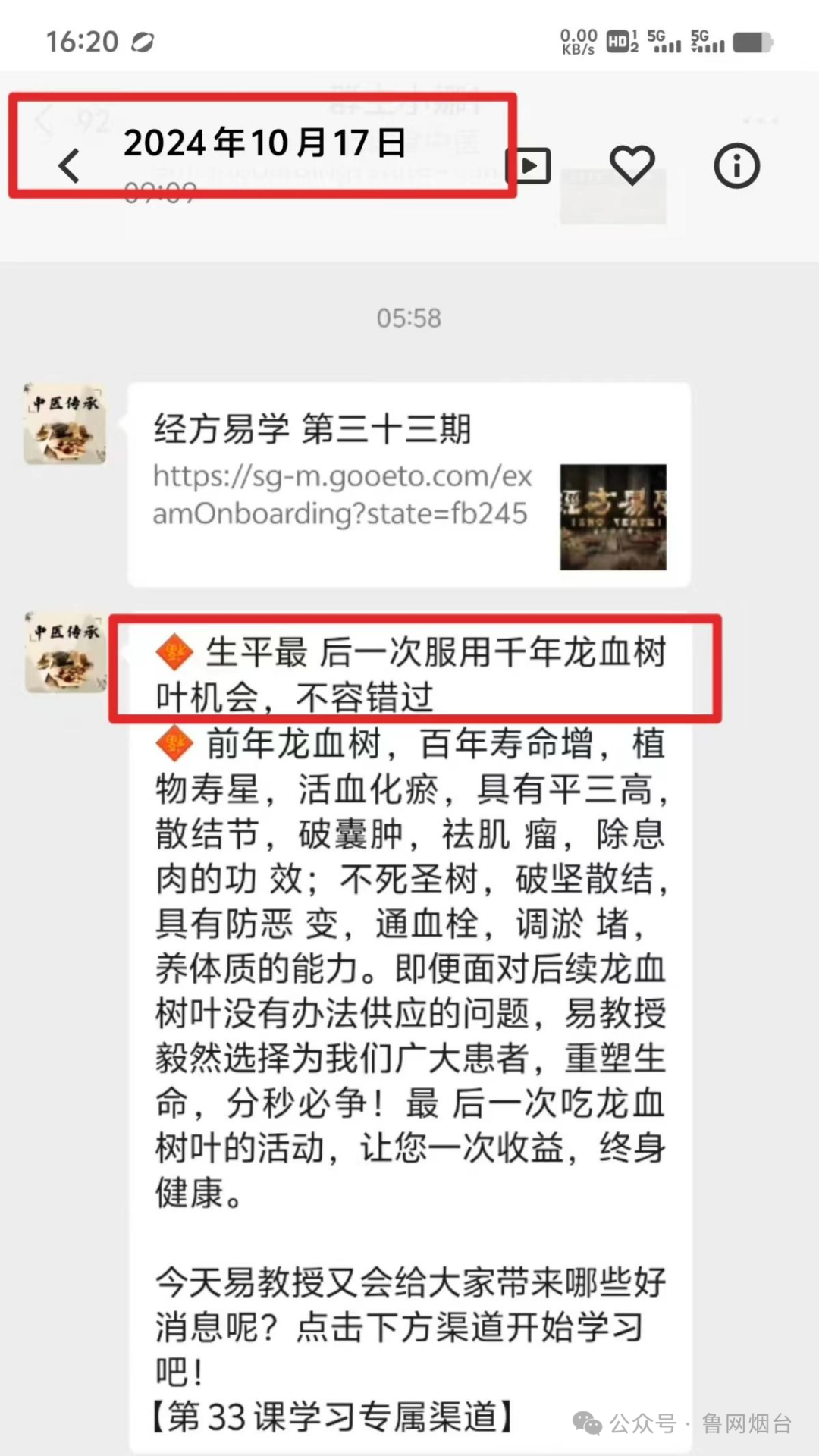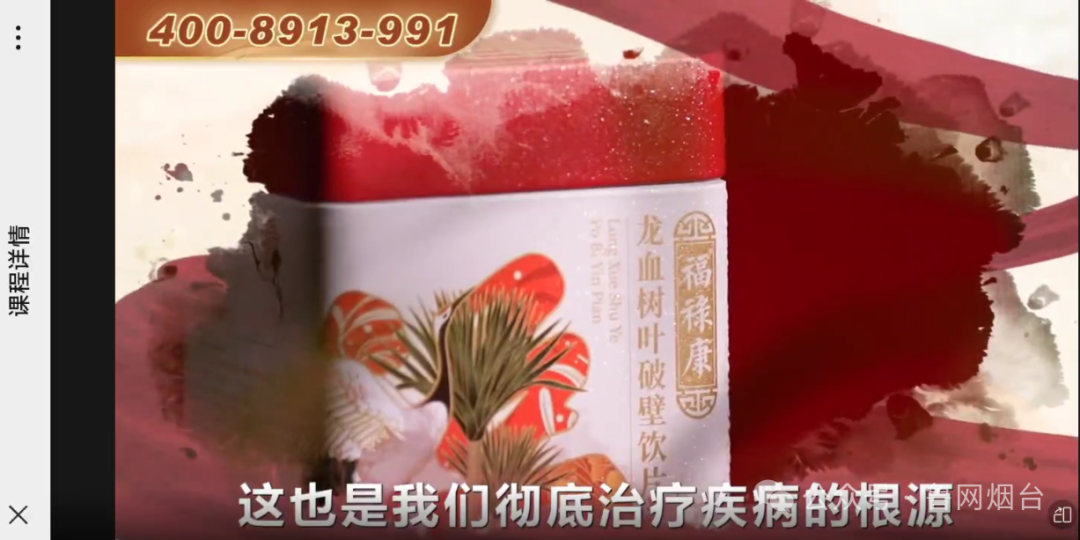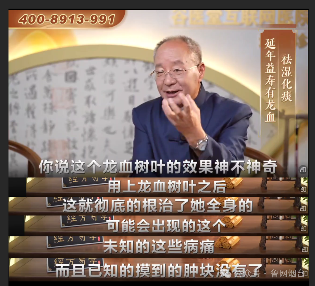 黃女士的母親出于對(duì)易法銀教授權(quán)威身份的信任,購(gòu)買了價(jià)值不菲的“龍血樹葉破壁飲片”。使用兩個(gè)周期后,她的身體疾病癥狀并未得到緩解。今年1月份,黃女士的母親再次被拉入另一個(gè)微信群,群內(nèi)還在播放《經(jīng)方易學(xué)》的視頻,這次除了主持人的衣服顏色有變化,其他內(nèi)容幾乎完全一樣,依然在推銷“龍血樹葉破壁飲片”?;叵肫鹑ツ暌追ㄣy教授節(jié)目中講述的“龍血樹葉”極為稀缺,是“生平最后一次服用千年龍血樹葉的機(jī)會(huì)了”,黃女士的母親意識(shí)到自己可能踩進(jìn)銷售陷阱。