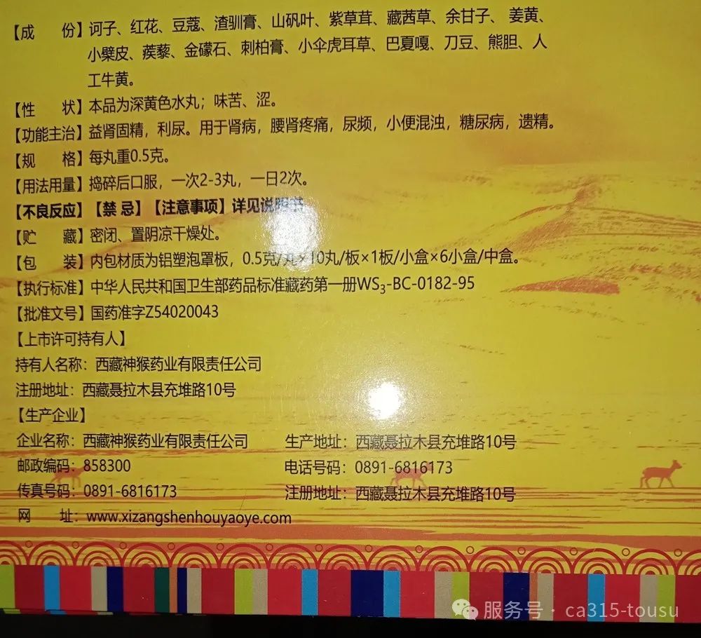 消費(fèi)者吉先生告訴315誠(chéng)搜網(wǎng),起初他也不信糖尿病能治愈的廣告宣傳,由于廣告中提到“藏藥”二字,讓他深信不疑,才讓他起心動(dòng)念,主動(dòng)撥打400電話咨詢的。然而,收到貨后卻是一款由西藏神猴藥業(yè)有限責(zé)任公司生產(chǎn)的“十八味訶子利尿丸”,翻遍整個(gè)外包裝,也沒(méi)有“藏藥”提示,只有類似商標(biāo)的“漟漮”字樣,服用后也無(wú)廣告中宣稱的所謂“療效”,血糖沒(méi)有降下來(lái),泡沫尿等癥狀還跟以前一樣,簡(jiǎn)直就是在坑騙老年人。