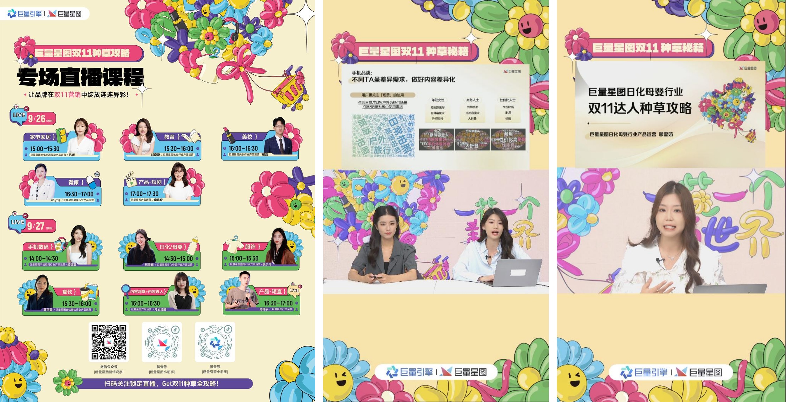 為了全方位營銷布局的順利落地,巨量星圖在活動開始前發(fā)布了針對美妝、服飾、日化等9大行業(yè)的雙11趨勢報(bào)告,為品牌提供了寶貴的市場洞察,助力品牌把握大促靈感。還同步開啟“好內(nèi)容走花路”星圖系列直播課程,11位巨量星圖行業(yè)產(chǎn)品運(yùn)營專家通過分析消費(fèi)者需求和購買行為推出了針對性的種草策略。兩天時(shí)間收獲近42萬觀看量,其中視頻號觀看量達(dá)4.22萬,抖音端觀看量達(dá)37萬,互動點(diǎn)贊量高達(dá)188萬。