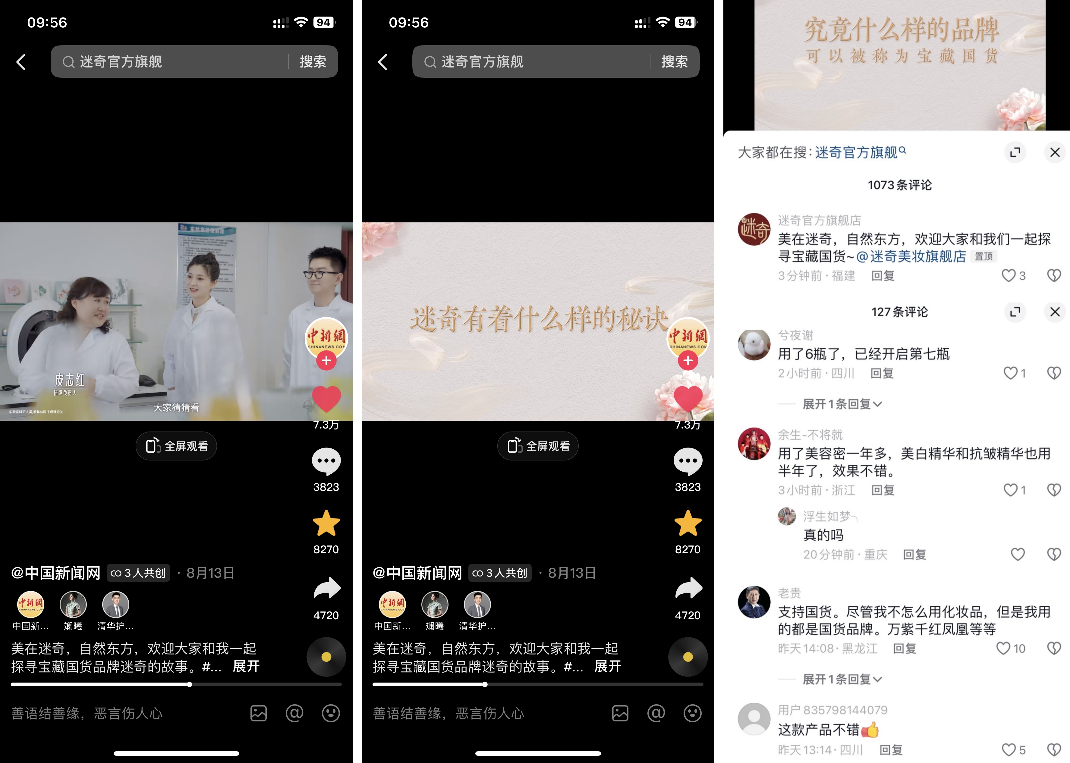 線上,既有頭部央媒中新網(wǎng)x浙江衛(wèi)視x明星達(dá)人運(yùn)動(dòng)員,多方聯(lián)動(dòng)共同為寶藏國(guó)貨背書,提升迷奇的行業(yè)影響力;又有互動(dòng)資源如話題頁(yè)定制、全民任務(wù)-現(xiàn)金模式-普通模式、搜索頁(yè)品牌榜Tab頂部Banner位等,其中主話題#寶藏國(guó)貨計(jì)劃 話題vv 6.2億+,品牌話題#迷奇讓美白滲透肌底 話題vv約5億+,助力品牌全域曝光;更有合作身份授權(quán)、藝人、達(dá)人、logo授權(quán)、平面&紀(jì)錄片等視頻物料授權(quán),幫助品牌沉淀資產(chǎn),實(shí)現(xiàn)長(zhǎng)效經(jīng)營(yíng)。