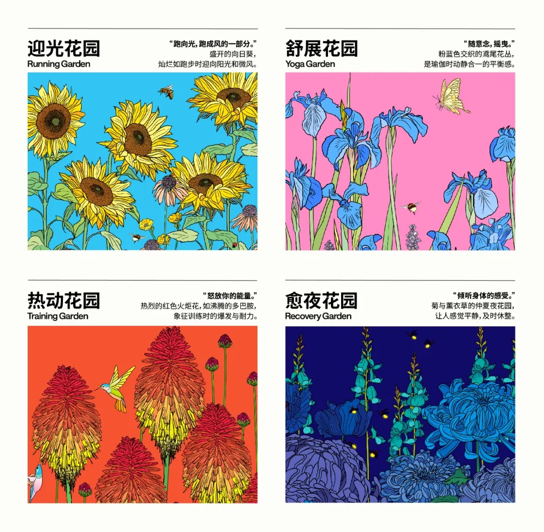 02 攜手社區(qū)伙伴,鼓勵(lì)“一起好狀態(tài)” 伴隨著報(bào)告的發(fā)布, lululemon正式開啟今年的“一起好狀態(tài)”主題活動(dòng),率先吸引眾人目光的是與Graphic Rewilding共同呈現(xiàn)的“好狀態(tài)心展花園”。憑借其鮮明的色彩和豐富的寓意(不同的花卉分別代表瑜伽、跑步、訓(xùn)練和恢復(fù)),該藝術(shù)作品旨在邀請生活在都市中的人們動(dòng)一動(dòng),讓身心松動(dòng),感受自己內(nèi)心的花園。