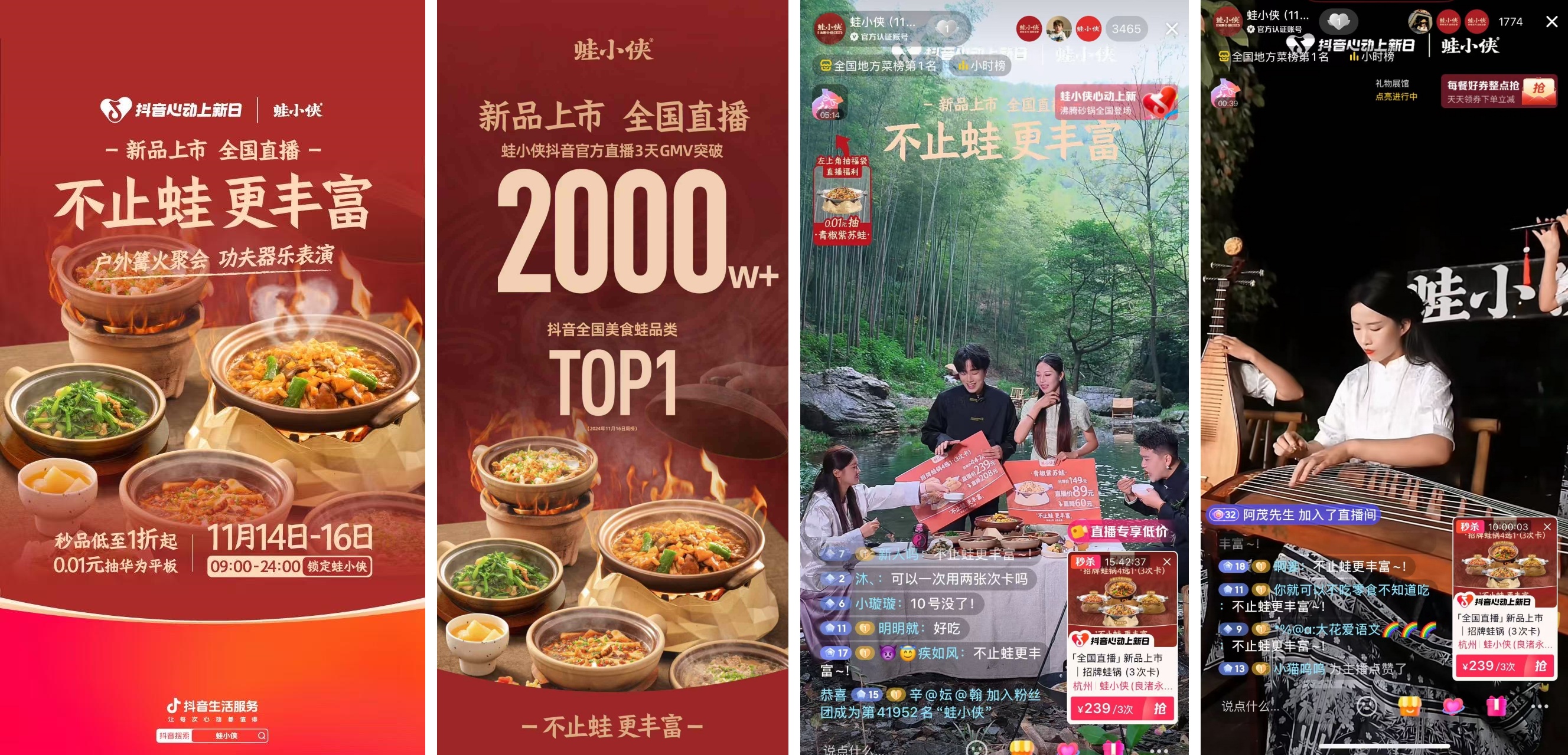 充滿 “俠風” 特色的蛙小俠品牌在“抖音心動上新日”特別推出了沸騰砂鍋蛙系列美食,圍繞“不止蛙,更豐富”活動主題,不僅將傳統(tǒng)的鐵鍋升級為更具特色的砂鍋,還在鍋內(nèi)融入了多種豐富食材,旨在賦予用戶更豐富多元的的味蕾體驗,同時在價格方面也展現(xiàn)出滿滿誠意,低至五折的優(yōu)惠讓消費者能夠輕松嘗鮮。在直播間的玩法上,蛙小俠進行了諸多創(chuàng)新嘗試。選址于戶外山谷場景,巧妙穿插主理人空降直播間、東方文化古典演繹等互動環(huán)節(jié),不僅提升了直播的趣味性和觀賞力,更彰顯了蛙小俠“堅守文化根基,傳承文化精髓”的品牌初心。此外,線下心動物料全面進店的舉措進一步強化了此次上新的曝光力度,打通了線下線上全渠道聯(lián)動,全力助推蛙小俠品牌餐飲交易額再創(chuàng)新高,不僅實現(xiàn)了新用戶人群的破圈傳播,還深度喚醒了老用戶的消費熱情。