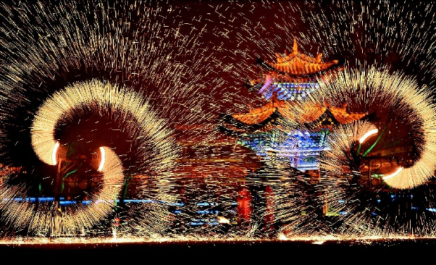 1月13日晚,在山東省棗莊市臺(tái)兒莊古城,民間表演隊(duì)為游客表演“火龍鋼花”。春節(jié)臨近,山東省棗莊市臺(tái)兒莊古城“年味”大戲持續(xù)上演,“火龍鋼花”、百獅賀歲、社火巡游等非物質(zhì)文化遺產(chǎn)表演輪番上演,精彩紛呈,為市民和游客獻(xiàn)上精彩的“文化大餐”。 cnsphoto 供圖