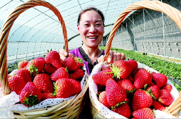 圖為贛榆區(qū)金山鎮(zhèn)恒匯果蔬種植農(nóng)場的工作人員在展示采摘的草莓。 cnsphoto 供圖