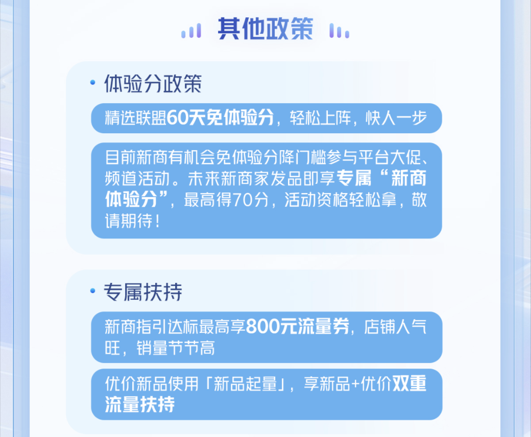 新商專屬的多項(xiàng)扶持措施也將同步上線,首先,新商家(入駐成功60天內(nèi)的商家)無(wú)體驗(yàn)分時(shí),可通過申請(qǐng)延長(zhǎng)賬期、提高商家保證金等方式加入精選聯(lián)盟,尋找合適的達(dá)人合作帶貨,還有機(jī)會(huì)參與平臺(tái)大促、頻道活動(dòng)。未來,新商發(fā)品即可獲得專屬“新商體驗(yàn)分”,最高可達(dá)70分,這些扶持都能幫助商家快速適應(yīng)平臺(tái),搶占市場(chǎng)先機(jī)。