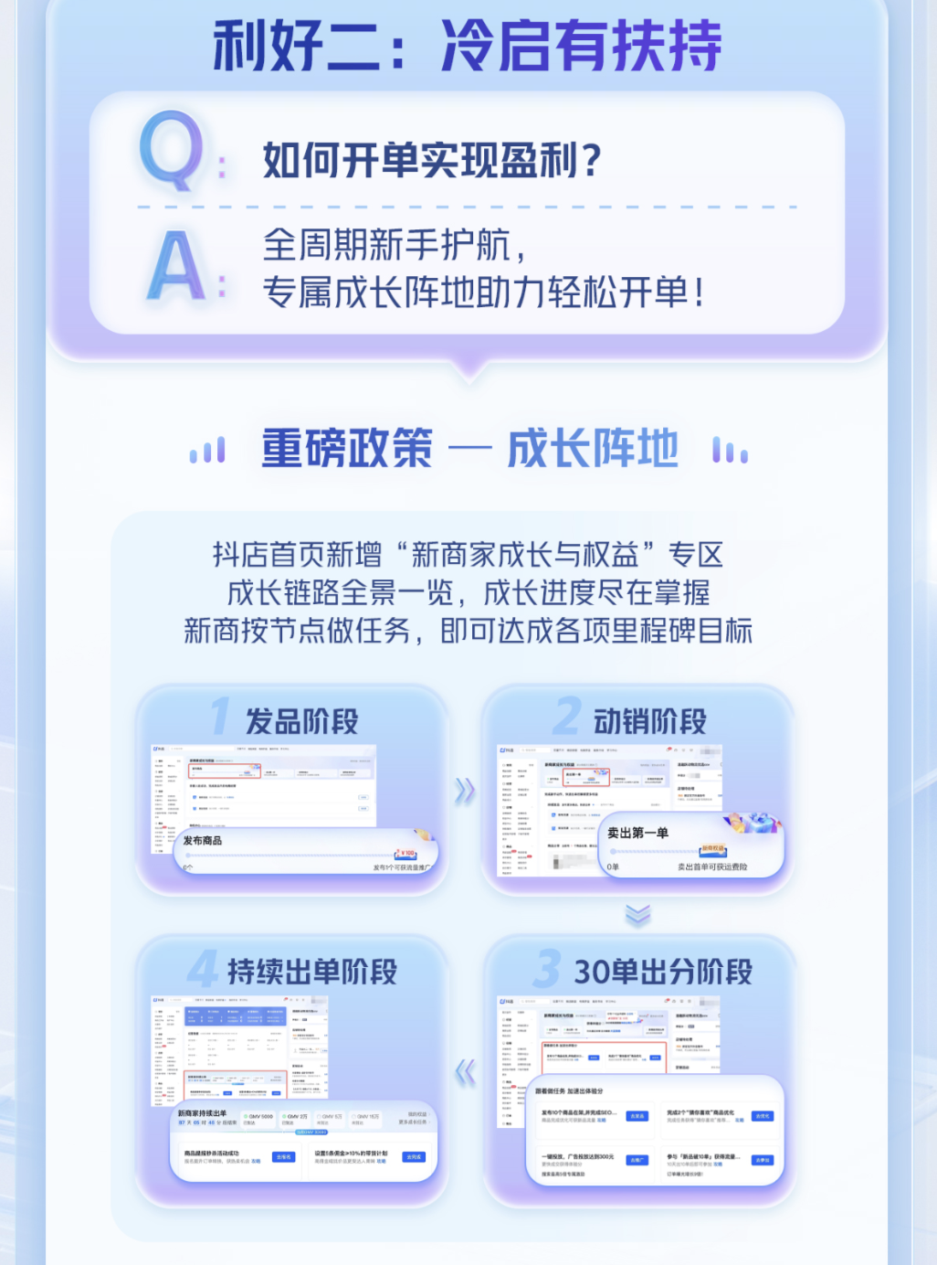 為了幫助新商家快速度過冷啟階段,抖音電商“成長(zhǎng)陣地”全面升級(jí) ,在抖店首頁(yè)新增了“新商家成長(zhǎng)與權(quán)益”專區(qū),新商能夠一覽“發(fā)品、動(dòng)銷、30單出分、持續(xù)出單”四大成長(zhǎng)節(jié)點(diǎn),即使是沒有經(jīng)驗(yàn)的商家,只要根據(jù)所在節(jié)點(diǎn)給出的指引,完成成長(zhǎng)任務(wù)、達(dá)成對(duì)應(yīng)里程碑目標(biāo),就能獲得相應(yīng)的權(quán)益和獎(jiǎng)勵(lì),新商家跟著指引成長(zhǎng)即可,每一步的進(jìn)度也都能盡在掌握。