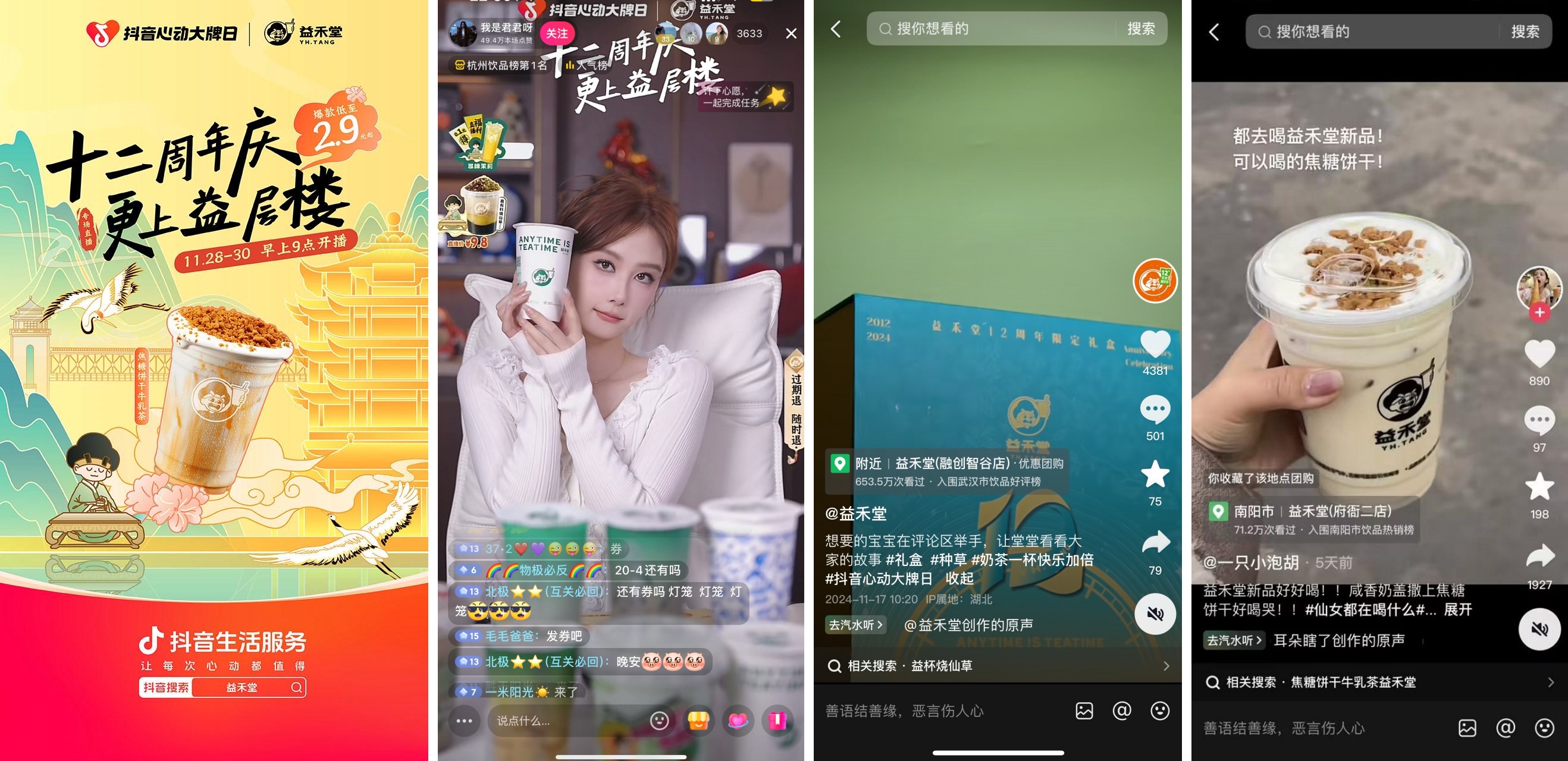 值此12周年慶典之際,深耕茶飲行業(yè)十余載的益禾堂品牌攜手「抖音心動(dòng)大牌日」IP,誠邀全網(wǎng)粉絲一同快樂慶生。品牌特別推出的兩大周年慶限定飲品——益禾烤奶與焦糖餅干奶茶,均以低至五折的驚喜價(jià)格回饋大家。在官方直播間,更有2.9元奶茶限量5萬份的秒殺活動(dòng),以及有效期長達(dá)60天的次卡福利,讓大家隨時(shí)隨地享受益禾堂帶來的心動(dòng)美味。為加大這一盛典的曝光范圍,益禾堂聯(lián)動(dòng)君君、肆兒等知名達(dá)人為直播間積極預(yù)熱。同時(shí),品牌在站內(nèi)持續(xù)發(fā)布800余條本地生活達(dá)人探店短視頻,從多維度深度種草用戶,助力#益禾堂直播 、#益禾堂十二周年 等相關(guān)話題熱度不斷攀升,推動(dòng)品牌在關(guān)鍵節(jié)點(diǎn)營銷中實(shí)現(xiàn)交易量的爆發(fā)式增長與高效轉(zhuǎn)化。