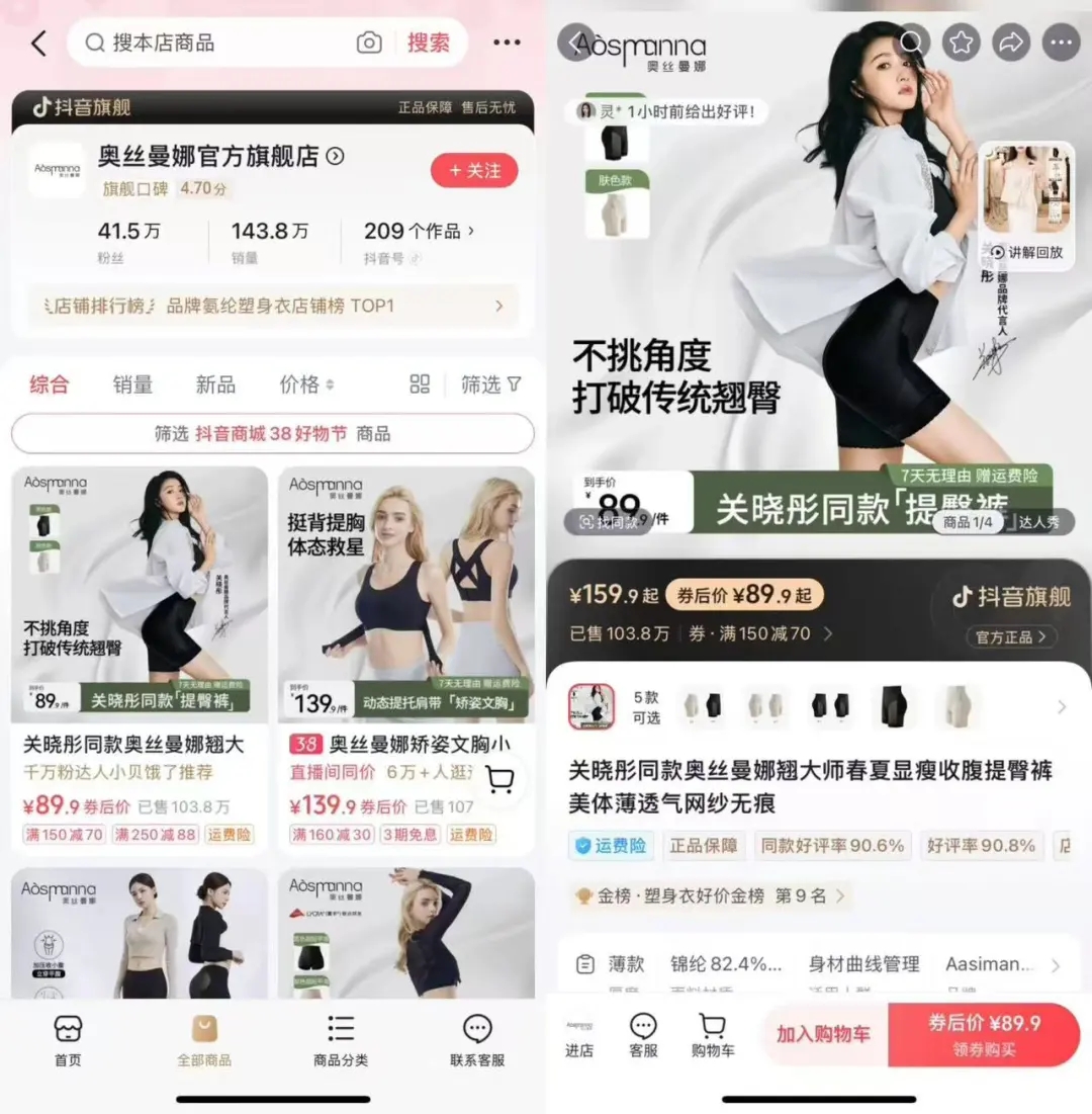 無獨(dú)有偶,李靜在抖音電商經(jīng)營(yíng)的內(nèi)衣褲襪店鋪中的某款無痕內(nèi)褲也賣爆了,因?yàn)橐粭l展示穿著無痕內(nèi)褲練瑜伽的視頻在平臺(tái)上發(fā)布一周內(nèi)獲得了百萬級(jí)別的播放。