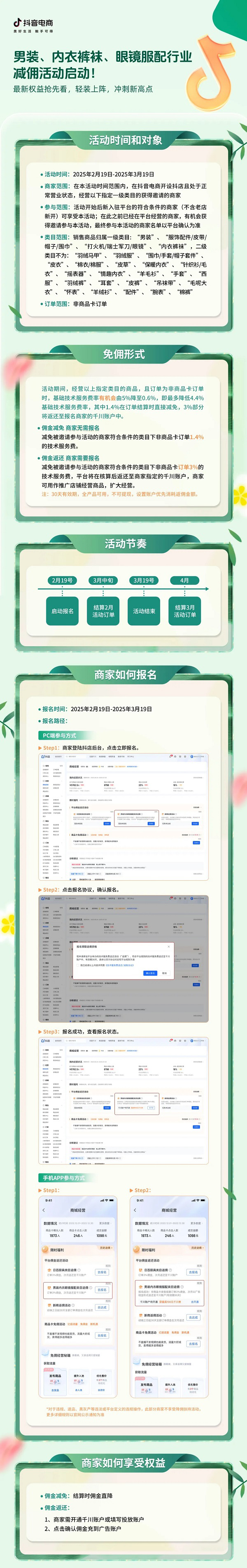 具體來說就是在抖音電商經(jīng)營(yíng)指定服配類目(男裝、內(nèi)衣褲襪、眼鏡服配)的商家在2.19-3.19活動(dòng)期間,針對(duì)非商品卡訂單,基礎(chǔ)技術(shù)服務(wù)費(fèi)率有機(jī)會(huì)由5%降至0.6%(僅收取基礎(chǔ)支付通道費(fèi)),其中1.4%在訂單結(jié)算時(shí)直接減免,3%部分將返還至報(bào)名商家的千川賬戶中。