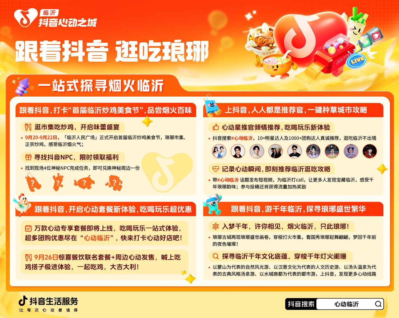 抖音生活服務(wù)將視線聚焦這座低調(diào)內(nèi)秀城市的美食文化精華,將在9月20日-10月9日重磅上線「心動臨沂」活動,耦合臨沂商務(wù)局主辦的“臨沂炒雞美食節(jié)”,在活動周期內(nèi)向用戶安利這座寶藏城市。線下舉辦炒雞大賽、美食市集,打造古風(fēng)主題門店呈現(xiàn)感官盛宴;線上開展短視頻大賽,并聯(lián)動高甜夫妻張倫碩&鐘麗緹、有顏有梗的唱作人張遠(yuǎn)、治愈系歌手顏人中、人氣偶像組合ONER(岳岳&靈超&木子洋)以及知名美食博主安秋金,一眾明星/超頭達(dá)人化身心動臨沂星推官,與抖音人氣古風(fēng)Coser“變裝”心動臨沂古風(fēng)推薦官一起助陣打call,與你共賞臨沂之味。心動之旅即刻出發(fā),快來一起看看吧!