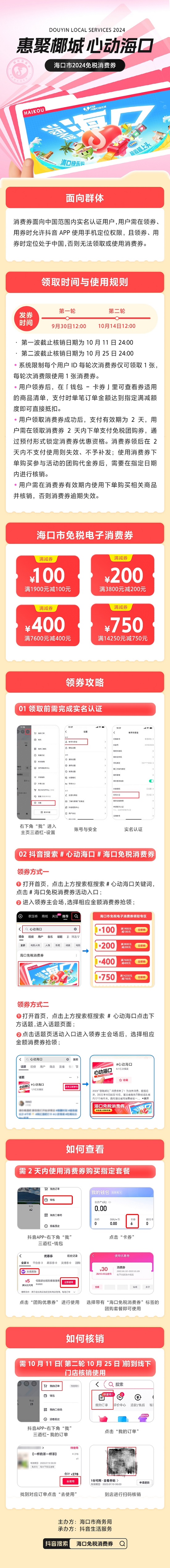 發(fā)券時(shí)間:首輪發(fā)券將于9月30日中午12點(diǎn)正式啟動(dòng),該輪次訂單截止核銷(xiāo)日期為10月11日24點(diǎn)。第二輪(根據(jù)資金實(shí)際剩余情況開(kāi)展,敬請(qǐng)期待)擬定發(fā)券為10月14日12點(diǎn),該輪次訂單截止核銷(xiāo)日期為10月25日24點(diǎn)。領(lǐng)券方式:想要領(lǐng)取這份專(zhuān)屬的購(gòu)物優(yōu)惠嗎?參與方式非常簡(jiǎn)單,只需在抖音App搜索“??诿舛愊M(fèi)券”或搜索“心動(dòng)???rdquo;、“惠聚椰城”,進(jìn)入活動(dòng)主會(huì)場(chǎng)后用戶就能輕松參與搶券了。也可在活動(dòng)參與商家的抖音POI主頁(yè)面或商家活動(dòng)期間直播間進(jìn)行領(lǐng)取。國(guó)范圍內(nèi)的抖音實(shí)名登錄用戶均可參與領(lǐng)取,每個(gè)輪次每人僅可領(lǐng)取1張。