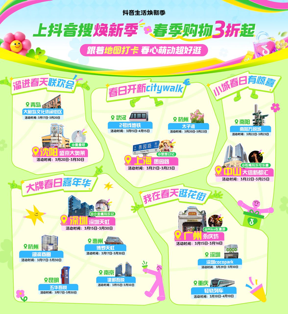快來(lái)查收這張「春心萌動(dòng)打卡地圖」,跟抖音生活一起全國(guó)巡回過(guò)春天,為你的春日煥新儀式感再加碼