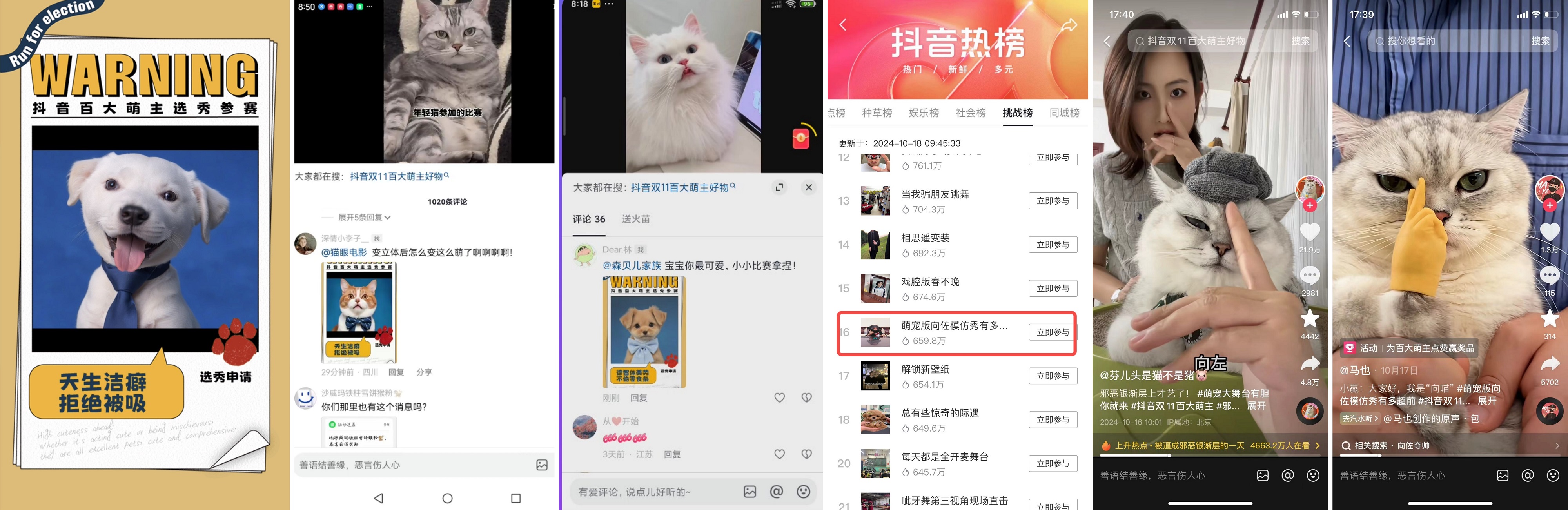 活動充分激發(fā)達(dá)人與用戶的創(chuàng)作欲,AI特效、cos玩梗、音樂創(chuàng)意等玩法涌現(xiàn)?!続I寵物出道照】站內(nèi)特效憑借趣味、便捷的優(yōu)勢,贏得了廣泛青睞,不僅一眾明星達(dá)人利用該特效報名參與本次百大萌主選秀,更有眾多網(wǎng)友自發(fā)用特效隔空喊話其他IP參賽。期間,既寵物玩梗向佐的風(fēng)潮席卷站內(nèi),引發(fā)了眾多博主的跟風(fēng)模仿,帶動話題#萌寵版向佐模仿秀有多超前 迅速登陸抖音挑戰(zhàn)榜TOP16;更產(chǎn)出了“好煩做貓真的好難” “萌寵版atp挑戰(zhàn)” “一群小貓貓里為何選中我” “百萬運鏡貓咪版”等熱門bgm和視頻玩法,帶動這場選秀活動成為了一場全民娛樂的狂歡。