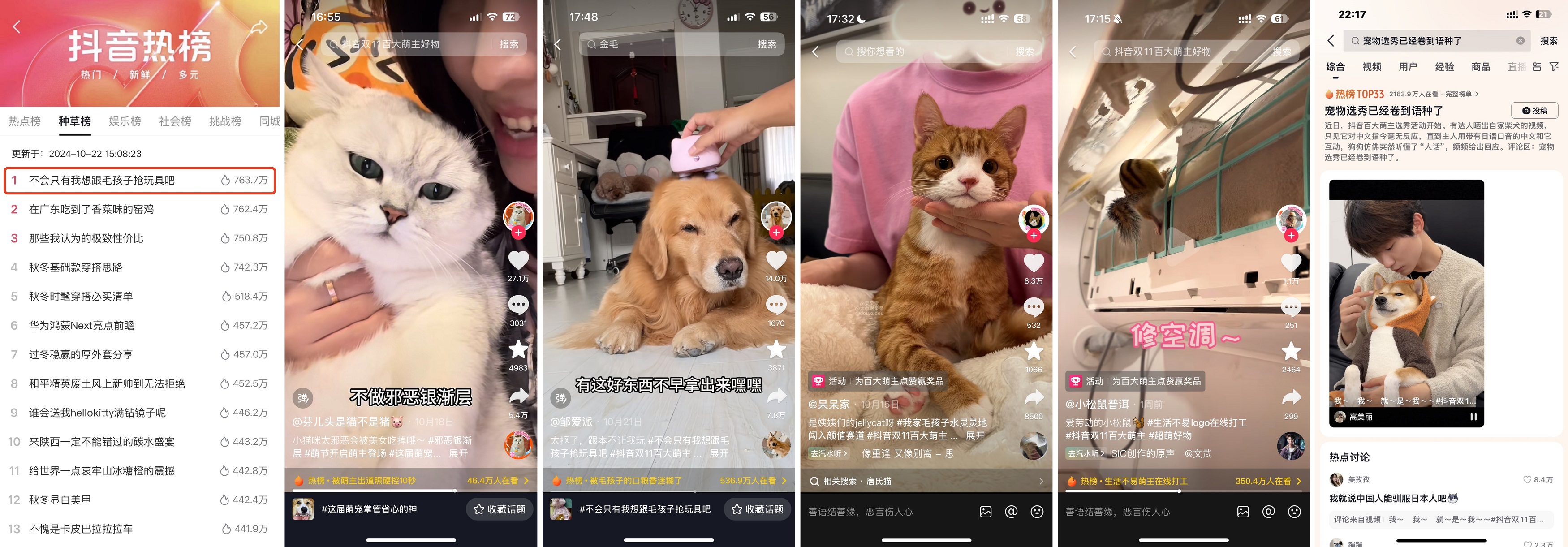 活動期間,抖音電商首次開啟「百大萌主選秀」內(nèi)容玩法,通過好內(nèi)容破圈爆發(fā),助力商家收獲新的增長機遇。圍繞德智體美勞五大維度,「百大萌主選秀」攜手眾多萌寵達(dá)人展開了一場別開生面的“上才藝”比拼盛宴,全方位挖掘并展現(xiàn)萌寵們的獨特魅力。選秀比拼的花式奇招甚至卷到語種,引發(fā)站內(nèi)話題#寵物選秀已經(jīng)卷到語種了 爆火出圈。同時,選秀期間#不會只有我想跟毛孩子搶玩具吧 話題迅速發(fā)酵,登陸抖音種草榜TOP1,#這屆萌寵掌管省心的神 話題播放量超1.6億,憑借高熱度登陸抖音總榜。