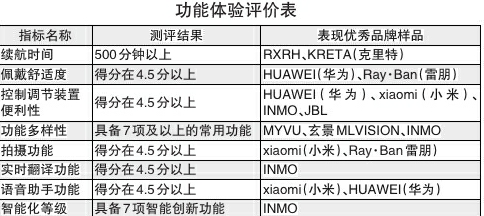 在功能體驗評價方面,15款樣品的續(xù)航時間在97分鐘到673分鐘之間,其中RXRH、KRETA(克里特)品牌的樣品續(xù)航時間在500分鐘以上,表現(xiàn)優(yōu)秀。HUAWEI(華為)、Ray· Ban(雷朋)品牌的樣品佩戴舒適度表現(xiàn)優(yōu)秀;HUAWEI(華為)、xiaomi(小米)、INMO、JBL品牌的樣品控制調節(jié)裝置便利性表現(xiàn)優(yōu)秀。MYVU、玄景MLVISION、INMO品牌的樣品具備7項及以上的常用功能,功能多樣性表現(xiàn)優(yōu)秀;xiaomi(小米)、Ray·Ban(雷朋)品牌的樣品拍攝功能表現(xiàn)優(yōu)秀;INMO品牌的樣品實時翻譯功能表現(xiàn)優(yōu)秀;xiaomi(小米)、HUAWEI(華為)品牌的樣品語音助手功能表現(xiàn)優(yōu)秀;INMO品牌的樣品具備7項智能創(chuàng)新功能,智能化等級較高,表現(xiàn)優(yōu)秀。