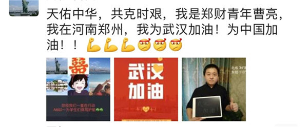 為傳播青春力量,助力抗“疫”信心,鄭州財經(jīng)學(xué)院團(tuán)委發(fā)起以“天佑中華,共克時艱,為武漢加油!為中國加油!——鄭財青年在行動”為主題的朋友圈傳遞助力抗“疫”活動,共同為抗擊疫情加油。 目前該校已有近2000名師生積極通過微信分享至朋友圈,用愛心傳遞正能量,凝聚起戰(zhàn)勝疫情的強大力量,給予同胞精神上的支持和鼓勵。