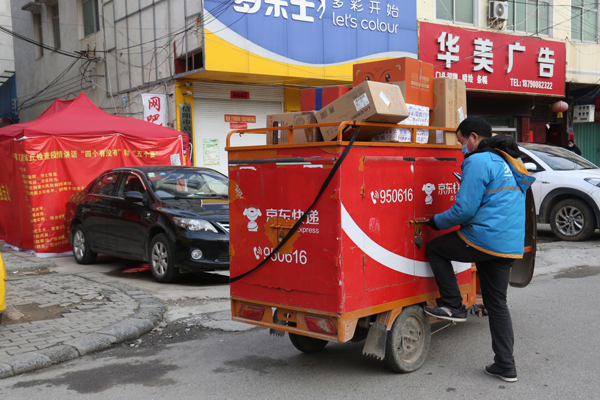 圖為2020年3月1日,兩家快遞小哥送快件時的情形。