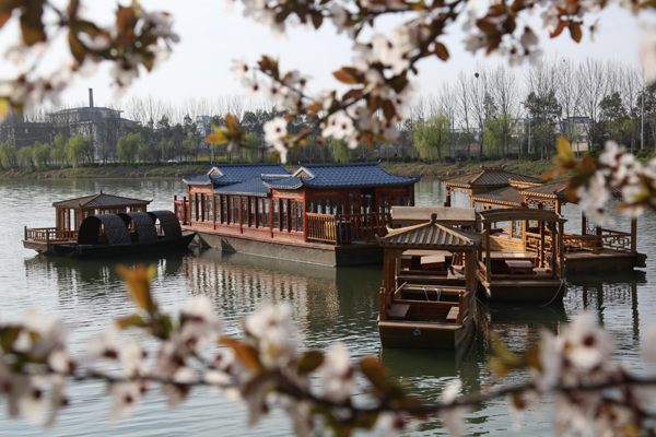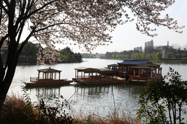2020年3月15日,在河南省淮濱縣東湖湖心島上,一棵棵櫻花怒放,湖中的游船、烏篷船隨著湖面的習習春風,不時地變換著姿態(tài),一晃一景、一晃一圖、一晃一畫,讓人賞心悅目。(王長江 邱彥文)