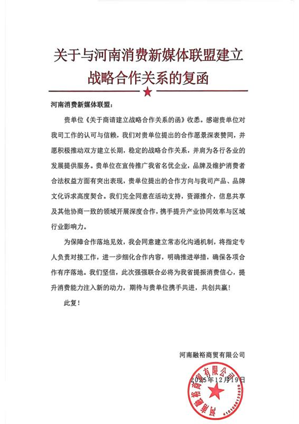 據悉,河南消費新媒體聯(lián)盟經過七年發(fā)展,已構建起連接政府、企業(yè)與消費者的有效橋梁,通過消費體察、維權宣傳等務實行動,累計為消費者挽回經濟損失超過800萬元。此次合作,雙方將圍繞品牌傳播、消費者權益保護、行業(yè)規(guī)范共建等方面展開協(xié)作。聯(lián)盟的媒體資源與公信力平臺,將為融裕商貿的品牌發(fā)展提供助力,同時也推動企業(yè)在產品與服務層面持續(xù)優(yōu)化、向更高標準看齊。