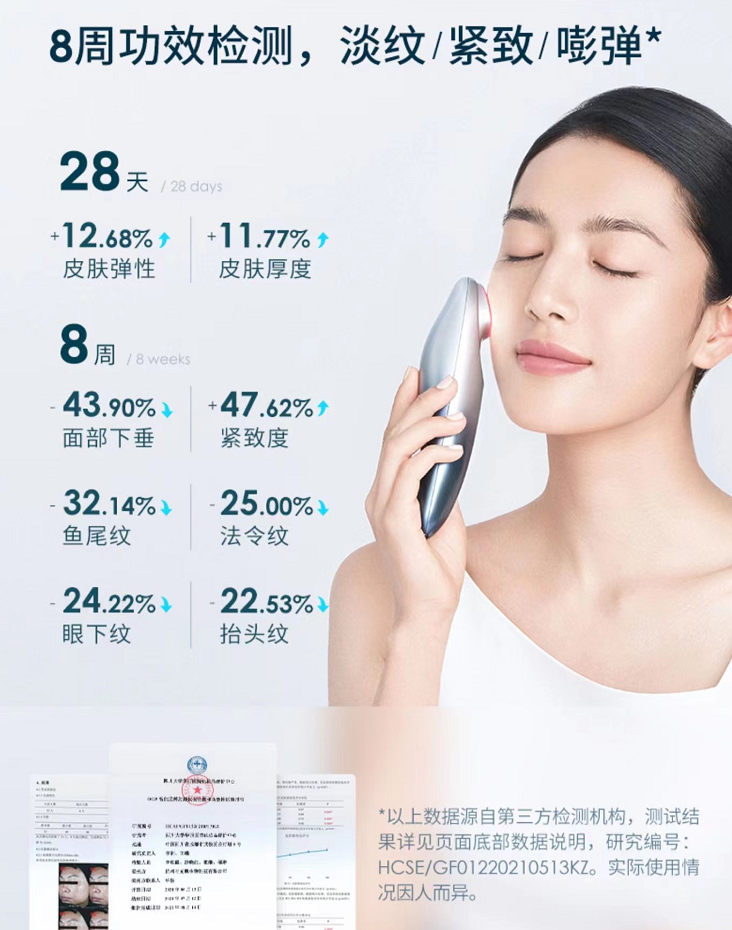 消費者在美麗肌因app的指導(dǎo)下使用OGP智能射頻儀護(hù)膚 在安全性和功效性上,OGP選擇科學(xué)、嚴(yán)謹(jǐn)、中立的權(quán)威機(jī)構(gòu)臨床試驗數(shù)據(jù)為消費者進(jìn)行驗證。據(jù)四川某三甲醫(yī)院化妝品功效評價中心臨床試驗數(shù)據(jù)顯示,測試志愿者連續(xù)使用8周OGP智能射頻儀,面部下垂改善43.9%,魚尾紋改善32.14%,法令紋改善25%,眼下紋、抬頭紋等多種老化痕跡均有不同程度的顯著改善。OGP智能射頻儀是目前唯一一個獲得該機(jī)構(gòu)功效驗證的國貨美容儀。 除此之外,OGP智能射頻儀還是全球首個搭載OTA遠(yuǎn)程升級功能的射頻美容儀,可以安全方便地升級美容儀的固件或軟件,幫助用戶節(jié)省購買新機(jī)的成本。