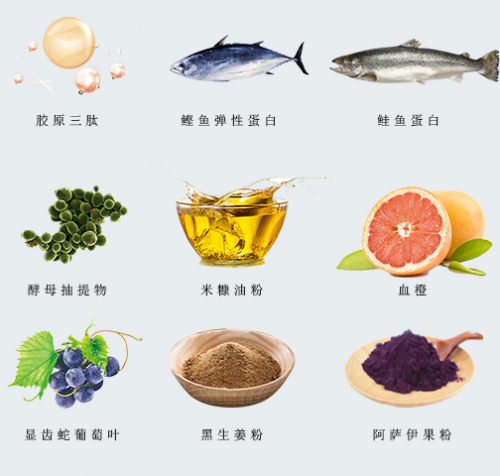 血 橙: 臨床試驗(yàn)證實(shí)血橙有效降低日光對(duì)皮膚的損傷;降低40%日光導(dǎo)致的紅斑 血橙有效減少日曬斑及色素沉積。 血橙可以效改善皮膚外觀、曬黑膚色均勻性。 顯齒蛇葡萄葉: 調(diào)節(jié)血糖、抗衰老、排毒功效 二氫楊梅素可以拮抗高糖誘導(dǎo)的細(xì)胞凋亡,顯效抗糖。 黑生姜粉: 富含多甲氧基類黃酮,體內(nèi)有效抗糖。 針葉櫻桃粉:針葉櫻桃富含維生素C,是世界上已知含維生素C最豐富的水果。其100克果實(shí)中VC含量達(dá)2445毫克,是名副其實(shí)的“維生素C之王”。 同時(shí)針葉櫻桃還含有維生素A、B1、B2、E、P、煙堿酸、抗衰老因子(SOD)、鈣、鐵、鋅、鉀和蛋白質(zhì)等多種營(yíng)養(yǎng)物質(zhì),營(yíng)養(yǎng)價(jià)值極高,有“生命之果”的美譽(yù)。其中維生素P能防止維生素C被氧化而受到破壞,增強(qiáng)VC的吸收和利用效果。 阿薩伊果粉:巴西莓粉 含維生素B1、B2、B3、B6、和B12,以及人體不會(huì)自然產(chǎn)生的歐米茄3、6、9.歐米茄能有效增加皮膚彈性。 含維生素A、B1、B2、B3、B6和B12、還有維生素C、D、E以及十七種主要礦物??寡趸锖途S生素A、C及E,有效加速人體細(xì)胞生長(zhǎng),修補(bǔ)受損肌膚。 含罕有的抗氧化物,能促進(jìn)肌膚細(xì)胞再生。 含抗物鋅、能調(diào)節(jié)皮膚油份和控制導(dǎo)致痤瘡及粉刺的荷爾蒙。 含十六種抗氧化物,有助身體排出毒素、消除疲勞、舒緩壓力、使人恢復(fù)精神改善睡眠質(zhì)數(shù)。 橄欖果粉:橄欖果提取物:強(qiáng)效清除體內(nèi)氧化成分,改善肌膚暗沉,老化,淡化深層色素沉積,由內(nèi)而外亮白肌膚。 橄欖果含有大量多酚類物質(zhì),羥基酪醇為其中重要成分,具備: ◆ 獨(dú)特的美白作用、能抑制黑色素生成、 ◆ 并能使細(xì)胞年輕、減少皺紋和色斑 ◆ 具有很強(qiáng)的抗氧化作用 ◆ 為一小分子,作用快且效果明顯 ◆ 能被皮膚吸收并存在于角質(zhì)形成細(xì)胞中 ◆ 羥基酪醇能在攝取后 7 分鐘呈現(xiàn)在血中 能防止紫外線對(duì)肌膚造成傷害 防止肌膚變黑、變老、變皺 減少黑色素的生成 讓你有意想不到的美白效果。
