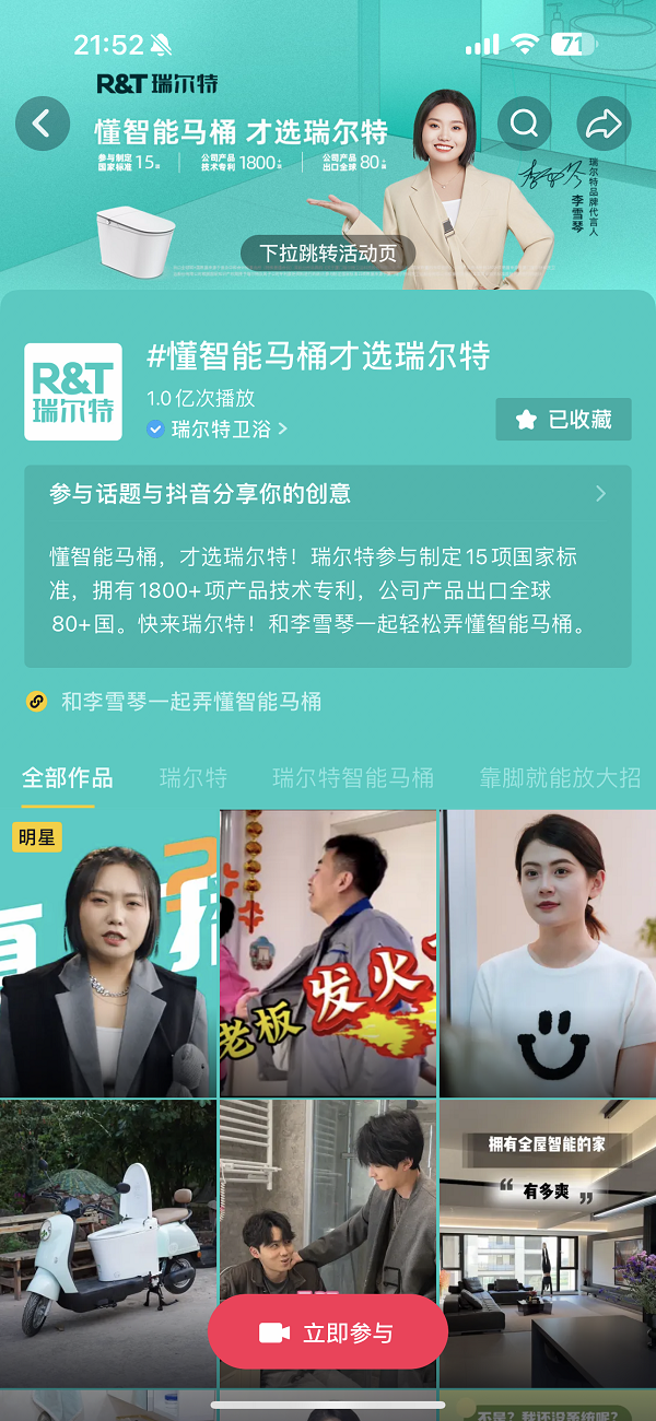 而瑞爾特更是借官宣代言人@李雪琴+達(dá)人矩陣,一舉引爆#懂智能馬桶才選瑞爾特 話題,同時(shí)官旗配套25周年福利等活動(dòng)承接用戶消費(fèi)最后一站,打通了從品牌到產(chǎn)品到銷售的全鏈路,單品穩(wěn)居虹吸式智能馬桶爆款榜TOP1。