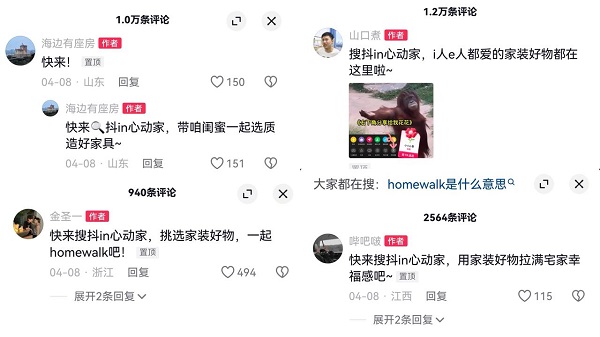 創(chuàng)意視頻、探家系列視頻、達(dá)人視頻、熱詞打造、商家激勵(lì)……一系列舉措環(huán)環(huán)相扣,「抖in心動(dòng)家」成功聯(lián)動(dòng)明星、達(dá)人、商家等共同創(chuàng)作的內(nèi)容場,和家具家裝行業(yè)商家組成的貨架場。優(yōu)價(jià)商家「排排坐,分果果」,獲得海量的垂類內(nèi)容篩選流量,低成本實(shí)現(xiàn)爆品打造,激發(fā)品牌增長新動(dòng)能。此外,「抖in心動(dòng)家」還打通抖音和住小幫,在更加精準(zhǔn)的人群中進(jìn)行品牌深度種草。