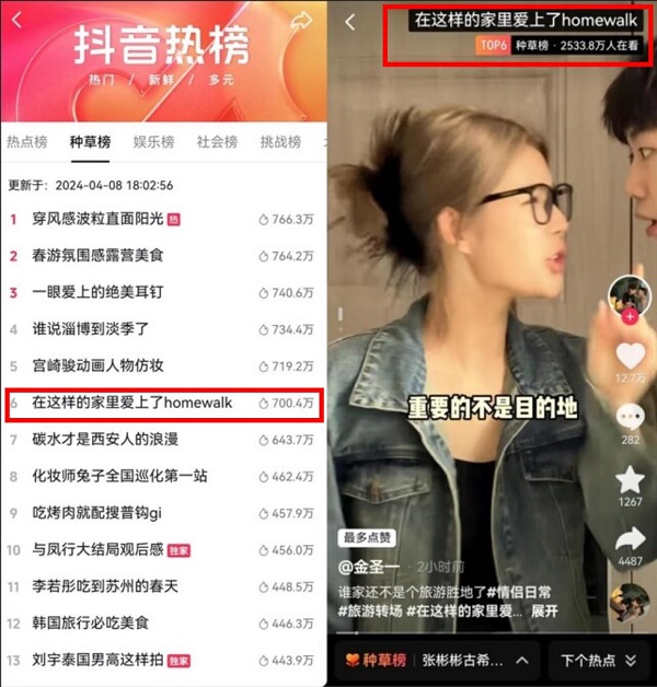 同時(shí),「抖in心動(dòng)家」結(jié)合春季家裝節(jié)點(diǎn)和站內(nèi)高熱話題citywalk,以家為核心打造新詞「homewalk」,聯(lián)動(dòng)與家場景強(qiáng)相關(guān)的熱度達(dá)人輸出趣味內(nèi)容,放大活動(dòng)影響力,商家也可借勢熱點(diǎn)話題,獲得曝光提升。4月8日,熱點(diǎn)話題詞#在這樣的家里愛上了homewalk 攀升至抖音種草榜TOP6,播放量高達(dá)3100w+。商家也能夠通過將這些熱點(diǎn)與自身的商品和短視頻內(nèi)容相結(jié)合,獲取平臺(tái)推薦流量,提升內(nèi)容場和貨架場的生意增量。