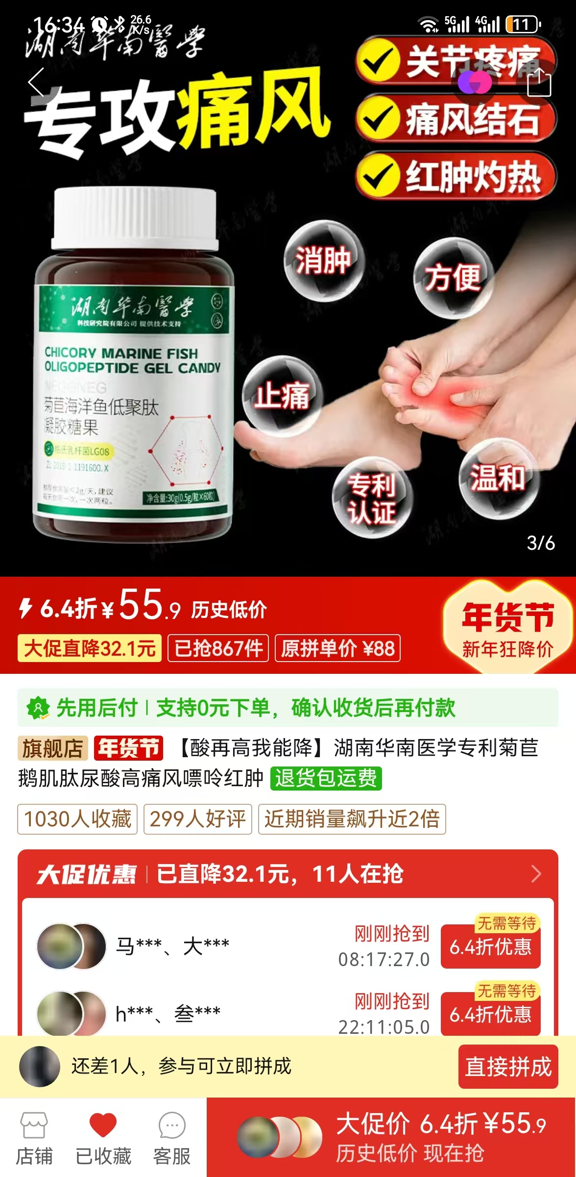 我因?yàn)轶y關(guān)節(jié)一直疼,然后自己平時(shí)喜歡吃海鮮,一直吃布洛芬來(lái)緩解疼痛,因?yàn)榕碌猛达L(fēng),在購(gòu)物平臺(tái)看見(jiàn)湖南健惠堂大藥房有限公司得產(chǎn)品菊苣海洋魚(yú)低聚肽凝膠糖果宣傳可以降低尿酸,專治痛風(fēng),客服也說(shuō)有助于促進(jìn)尿酸及毒素正常排放,調(diào)節(jié)酸堿平衡,減輕炎癥反應(yīng),舒緩因關(guān)節(jié)炎、風(fēng)濕、痛風(fēng)引起的關(guān)節(jié)腫大及疼痛。一瓶見(jiàn)效,然后我就買(mǎi)了一瓶,吃了沒(méi)啥效果,發(fā)現(xiàn)該產(chǎn)品是SC開(kāi)頭的普通食品,不能宣傳保健及治療功效,違反了食品安全法第38條、第73條,違反了廣告法第17條、第28條,違反了消費(fèi)者權(quán)益保護(hù)法第20條、第55條等等相關(guān)法律法條,商家如此昧著良心坑人害人,首先是耽誤治療時(shí)機(jī)。
