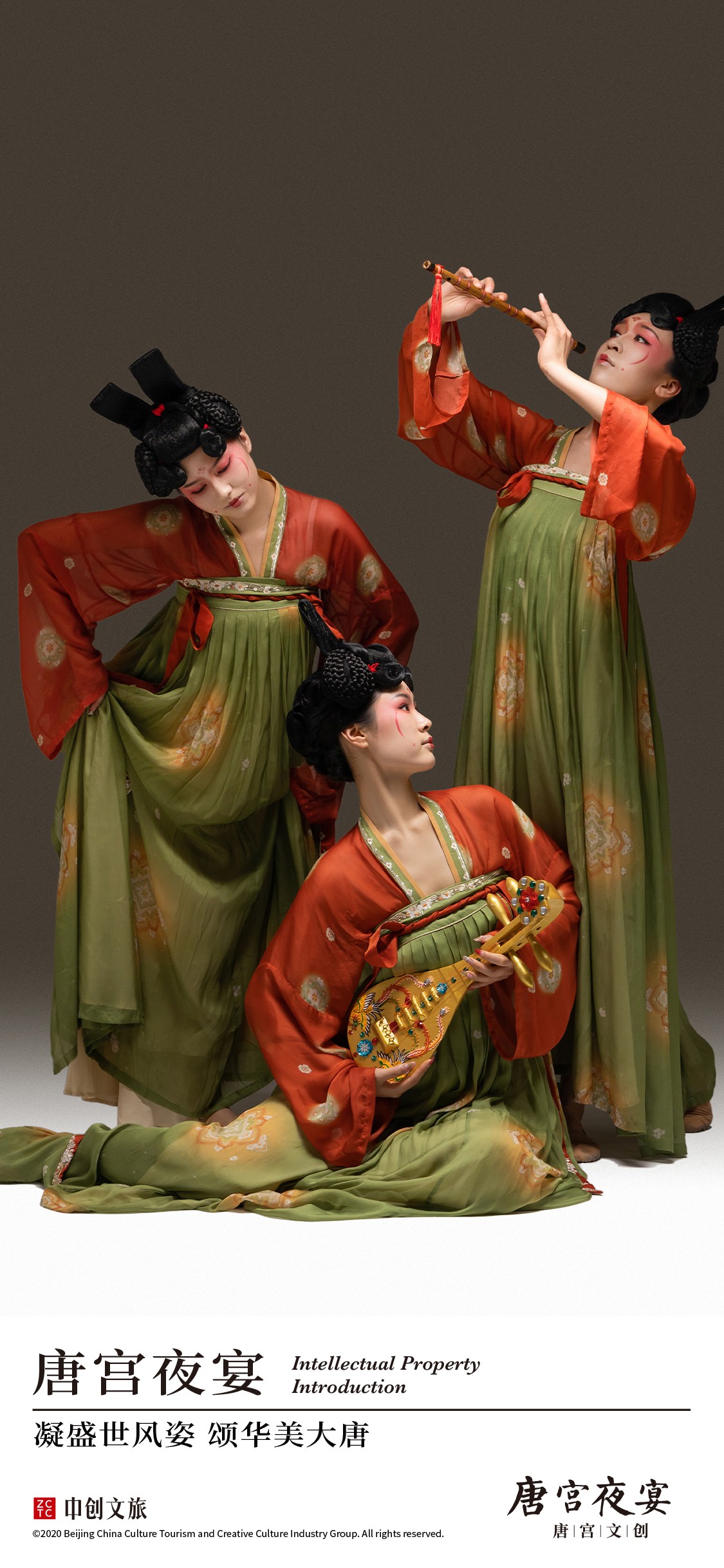 2021年,由河南廣播電視臺制作的河南省春節(jié)晚會播出,首次聚焦優(yōu)秀傳統(tǒng)文化的創(chuàng)新表達,古今交融的場景、精美用心的表演,將中國的年味兒、中原傳統(tǒng)的絢爛文化,展現(xiàn)的淋漓盡致,并迅速走紅網(wǎng)絡。 《唐宮夜宴》節(jié)目中,以夜宴的樂師們?yōu)橹鹘牵故玖颂瞥倥畟儚臏蕚?、整理妝容到夜宴演奏的過程。讓觀眾在欣賞“鬢云欲度香腮雪,衣香袂影是盛唐”的別樣豐腴身韻審美風姿的同時,感受中華厚重的歷史和文化。