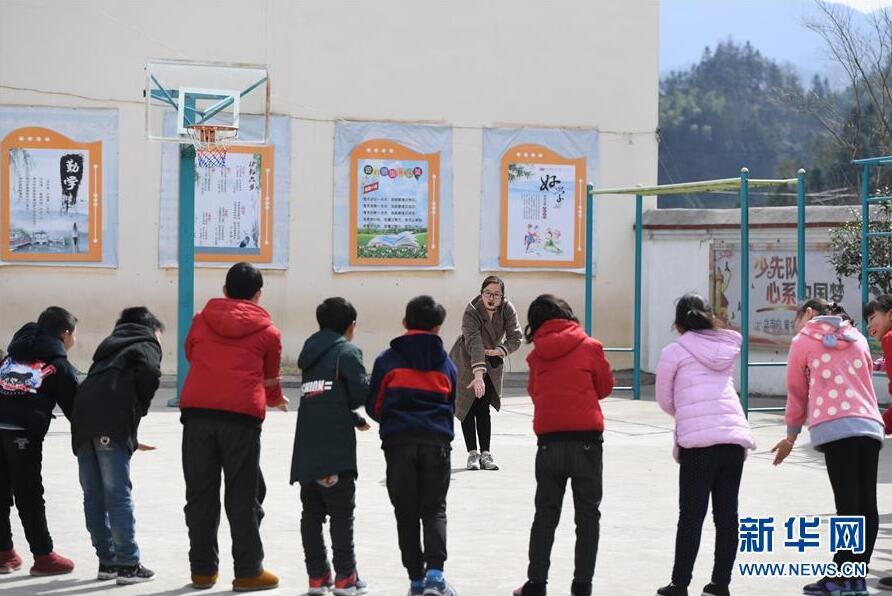 黃曉青(右一)在給孩子們上體育課(3月15日攝)。