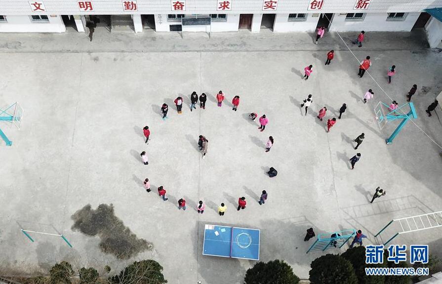 黃曉青與學(xué)生們?cè)趯W(xué)校操場(chǎng)做游戲(3月15日無(wú)人機(jī)拍攝)。