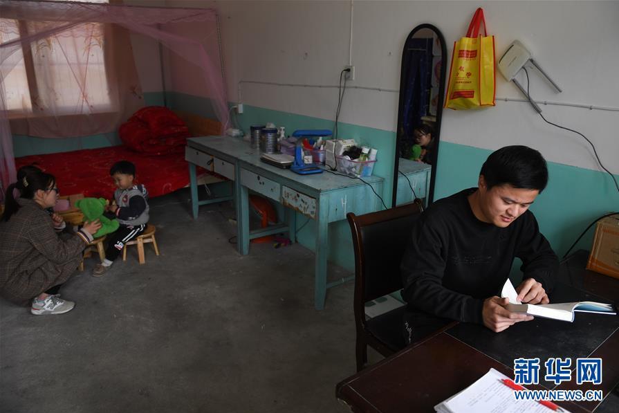 陳偉(右一)和妻子、女兒在學(xué)校的宿舍里(3月15日攝)。