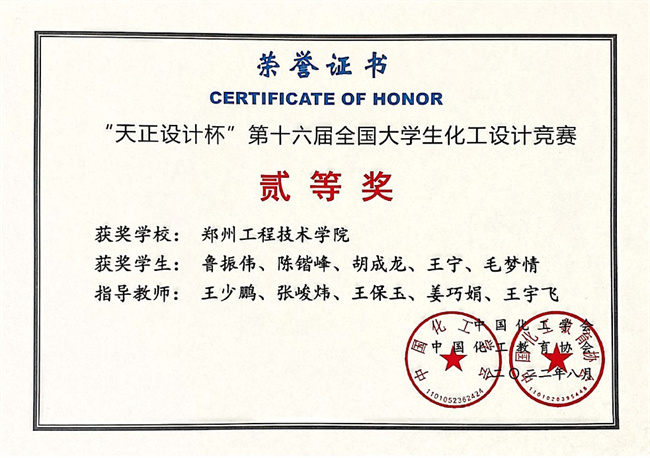 近日,第十六屆全國(guó)大學(xué)生化工設(shè)計(jì)競(jìng)賽組委會(huì)正式公布了2022年比賽結(jié)果,鄭州工程技術(shù)學(xué)院化工食品學(xué)院化學(xué)工程與工藝專業(yè)學(xué)子魯振偉、陳鍇峰、孟砥、王寧和毛夢(mèng)情等學(xué)生組成的“制醇聯(lián)盟”隊(duì),經(jīng)過(guò)單項(xiàng)打分、線上匯報(bào)和線上答辯,從華中賽區(qū)脫穎而出,榮獲國(guó)賽二等獎(jiǎng)。 全國(guó)大學(xué)生化工設(shè)計(jì)競(jìng)賽由中國(guó)化工學(xué)會(huì)和中國(guó)化工教育協(xié)會(huì)聯(lián)合主辦,為全國(guó)普通高校大學(xué)生競(jìng)賽排行榜賽事之一、教育部全國(guó)性A類賽事,是目前影響力最大、參賽隊(duì)伍最多、最具挑戰(zhàn)性、認(rèn)可度最高的全國(guó)高?;ゎ惐究粕鷮W(xué)科競(jìng)賽。2022年全國(guó)大學(xué)生化工設(shè)計(jì)競(jìng)賽分為賽區(qū)決賽(全國(guó)選拔賽)和全國(guó)總決賽兩個(gè)階段,全國(guó)共有415所高校的2939支隊(duì)伍報(bào)名參加選拔賽,參賽人數(shù)近1.5萬(wàn)人,經(jīng)過(guò)激烈角逐,60支優(yōu)秀代表隊(duì)伍晉級(jí)參加華東理工大學(xué)承辦的全國(guó)總決賽。