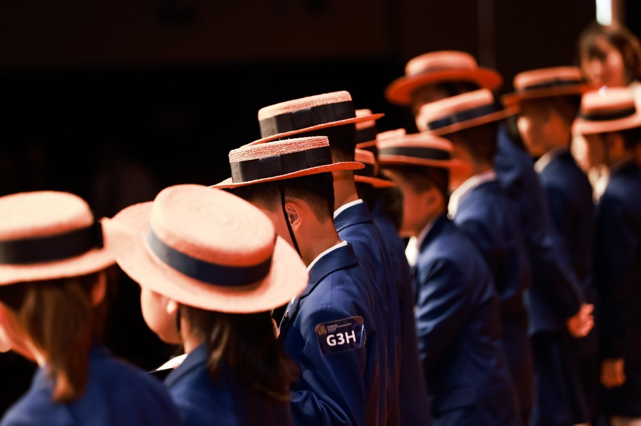 ▲學(xué)生帶上象征榮譽(yù)的哈羅草帽重返校園