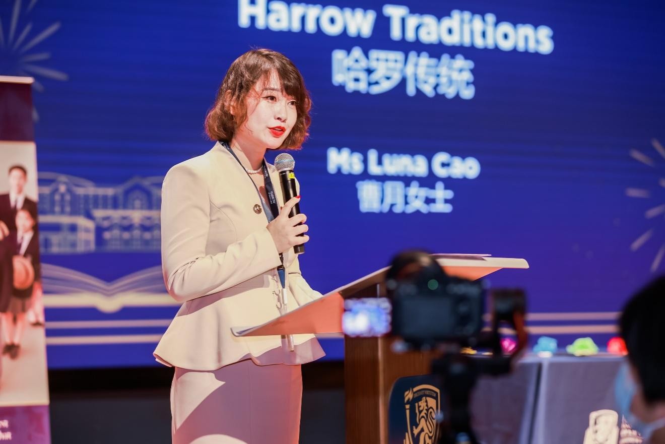 ▲哈羅南寧校長曹月介紹學(xué)校傳統(tǒng)及校園文化