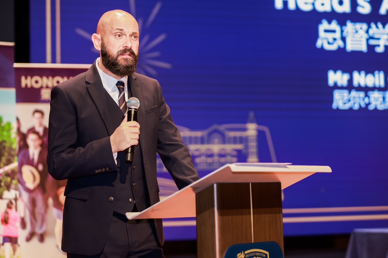 ▲哈羅南寧總督學(xué)尼爾·克萊頓先生開學(xué)致辭 校長曹月及總督學(xué)尼爾·克萊頓帶領(lǐng)全體中外籍教職員工在學(xué)校歡迎同學(xué)們的到來。在注冊日典禮上,總督學(xué)尼爾·克萊頓先生致辭,感謝教職團(tuán)隊以及所有學(xué)生和家長在過去一年為學(xué)校做出的貢獻(xiàn),并期待下個學(xué)年每個人都能攜手共進(jìn),更上一層樓,創(chuàng)造未來的無限可能。曹月校長向同學(xué)們介紹了學(xué)校傳統(tǒng),頒發(fā)入學(xué)證書,并一起學(xué)習(xí)哈羅傳統(tǒng)禮儀“頂帽禮”,借此希望同學(xué)們繼續(xù)銘記“勇氣”、“謙和”“榮譽(yù)”“互助”的價值觀。