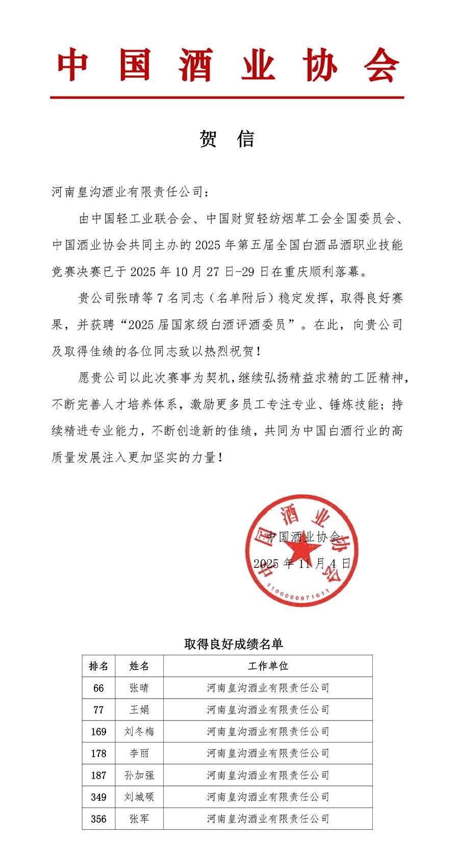 近日,備受行業(yè)矚目的第五屆全國白酒品酒職業(yè)技能競賽決賽圓滿落幕,2025屆國家級白酒評酒委員(簡稱“國評”)名單正式揭曉?;蕼暇茦I(yè)七位技術(shù)骨干憑借精湛的品評技能和扎實(shí)的理論功底,在激烈的競爭中脫穎而出,成功入選新一屆“國評”,截止目前,皇溝酒業(yè)以十大國評,領(lǐng)冠豫酒技術(shù)流。
